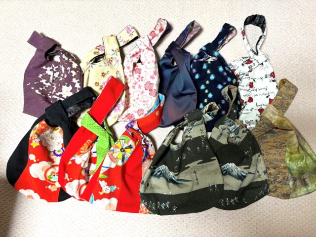 そこで、一念発起して、着物リメイクがてら、しじみバッグを15個作りました。
