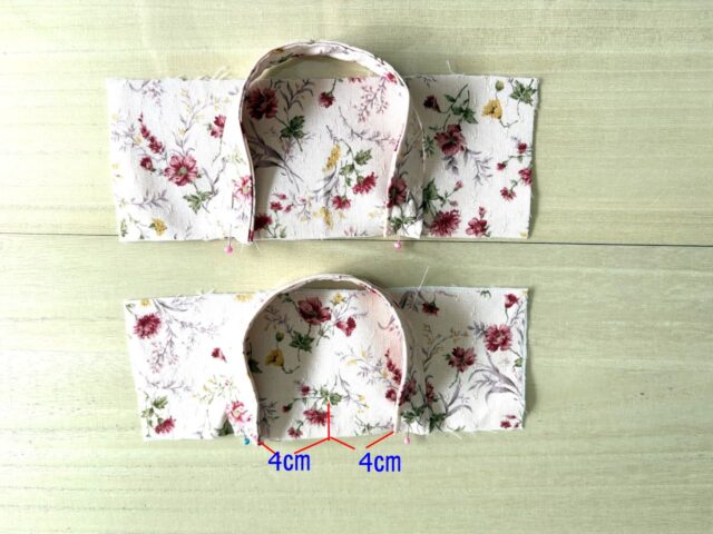 前中心、後ろ中心、両脇を合わせて上から3㎝のところを袋布にとめていく