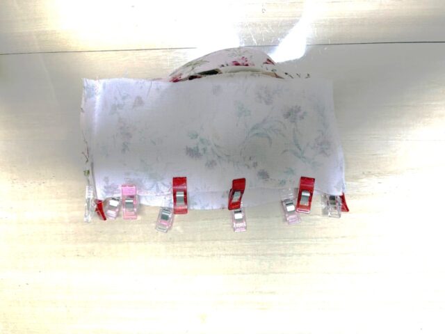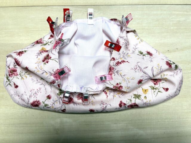表側の口布を裏側の口布を縫い合わせたミシン目が隠れるようにおりピンでとめる