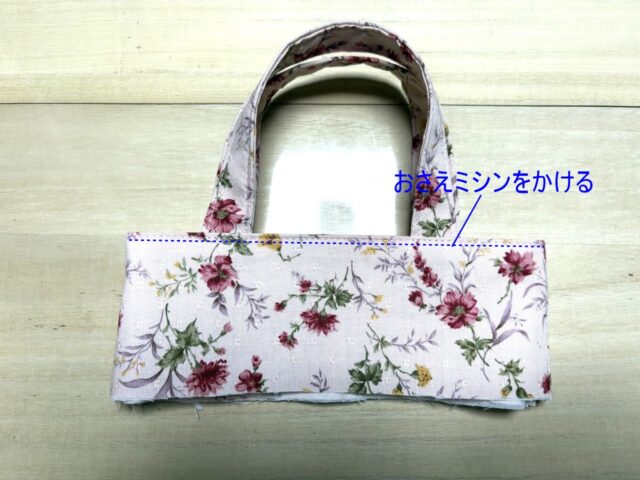 表側から口布の端をミシンでステッチを書けるように縫っていく